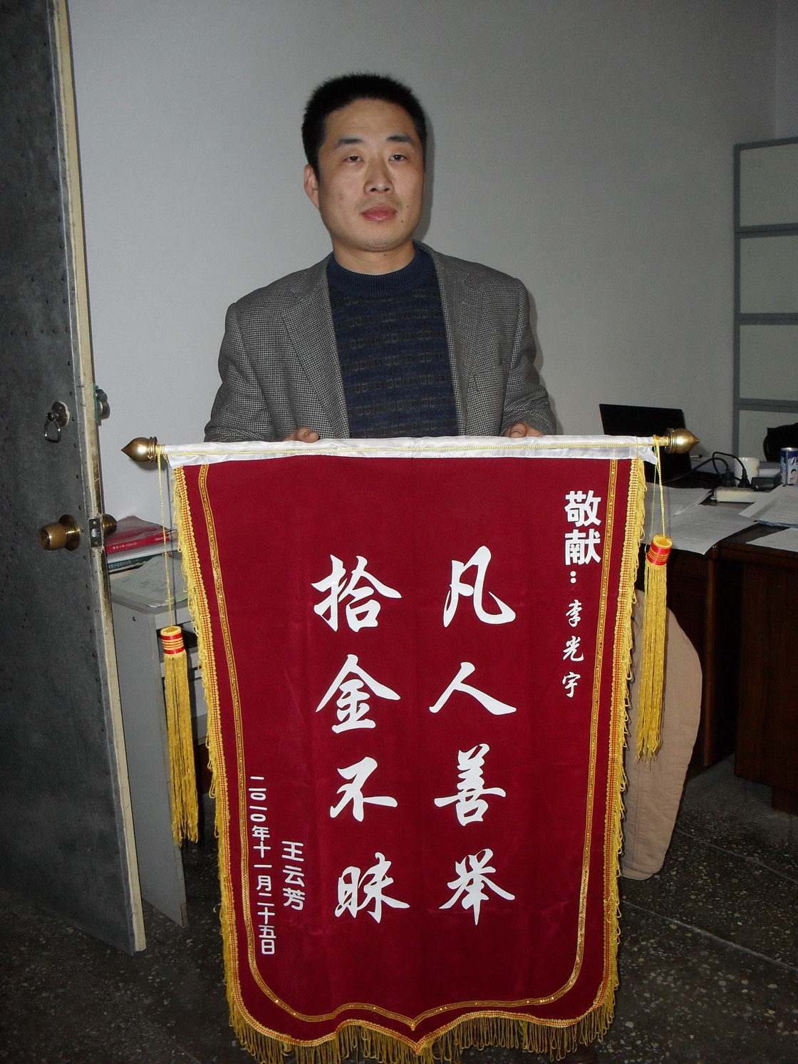 次日,為了再次對李光宇同志拾金不昧的事跡表示感謝,失主還千方百計(jì)的找到我公司的具體地址,并送上一面錦旗,我們對李光宇同志拾金 不昧的精神表示深深的敬意!