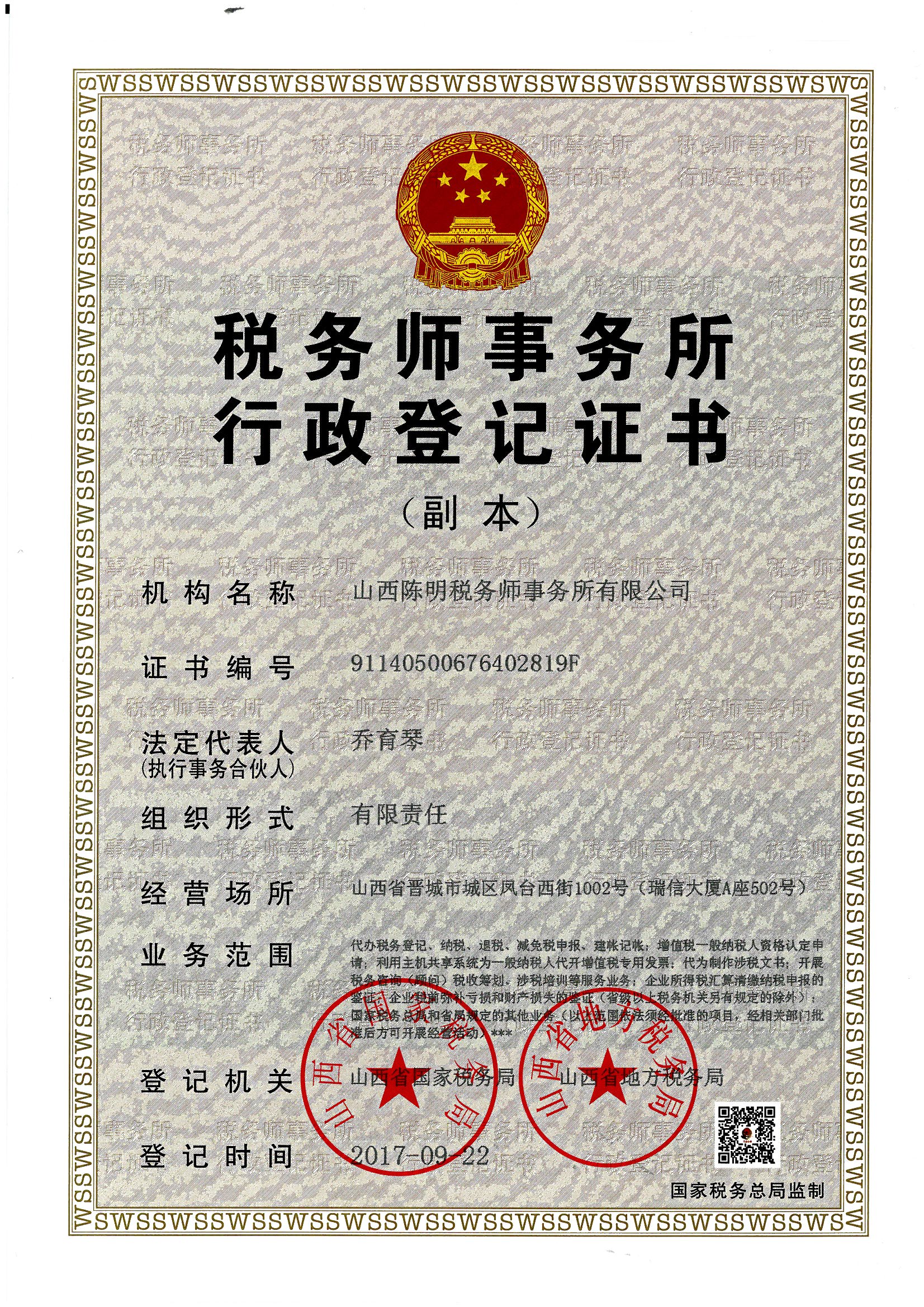 稅務(wù)師事務(wù)所登記證書