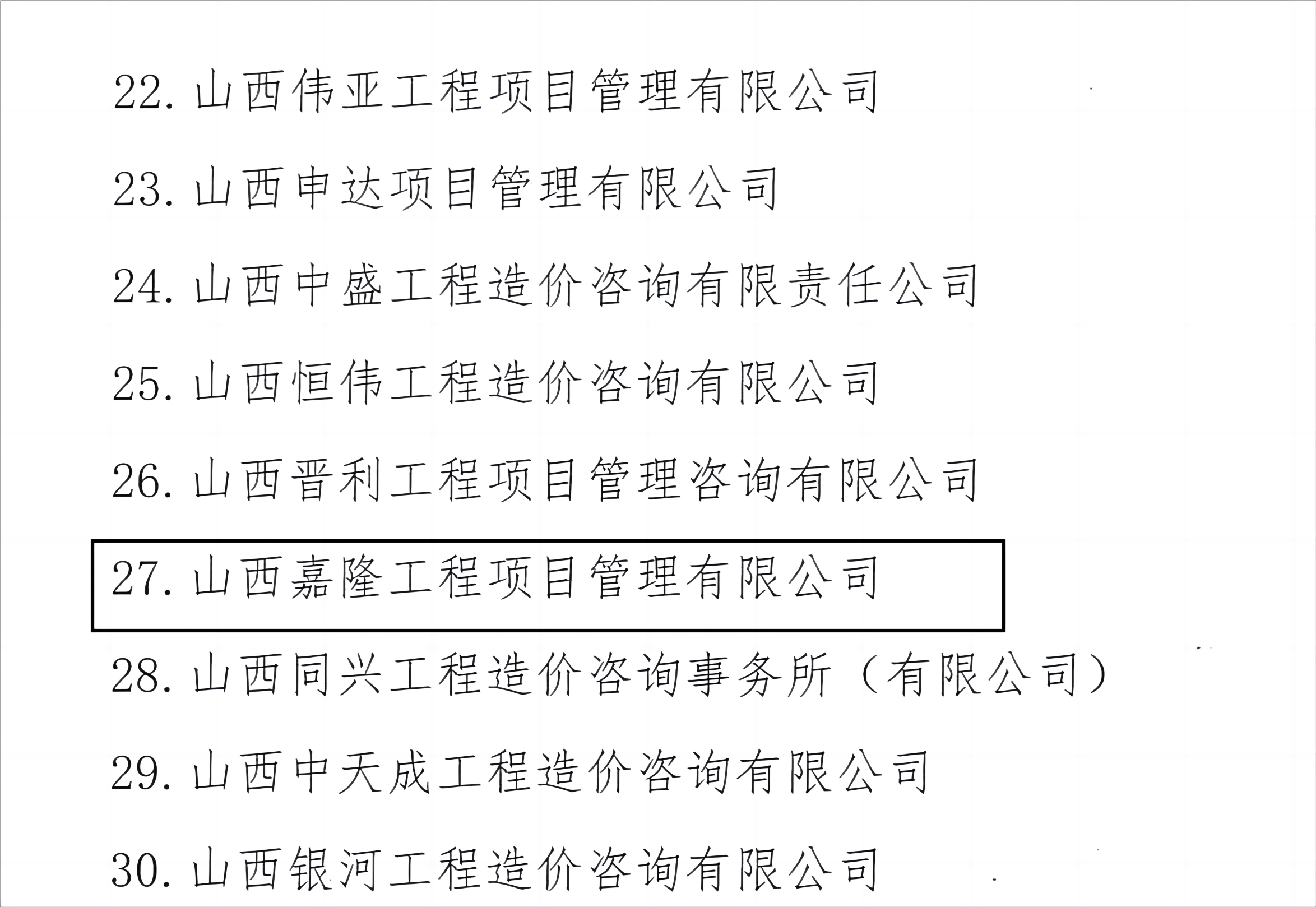 2023年,省價(jià)協(xié)開展2023年度“山西省工程造價(jià)咨詢業(yè)務(wù)骨干企業(yè)”、“山西省工程造價(jià)咨詢應(yīng)用創(chuàng)新領(lǐng)先企業(yè)"活動(dòng),我公司積極參與申報(bào),經(jīng)省價(jià)協(xié)初審、專家評(píng)審,最終,我公司入選2023年度“山西省工程造價(jià)咨詢業(yè)務(wù)骨干企業(yè)”。